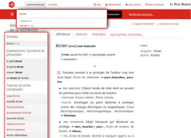 - Une fonction de recherche étendue pour trouver un mot ou une expression dans toutes les zones du dictionnaire (entrées, formes fléchies, expressions, locutions et proverbes…)